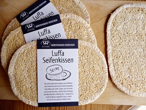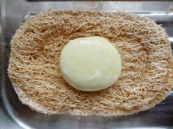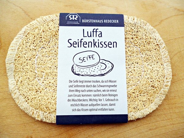Die Seife liegt immer trocken, da das Luffahgewebe Feuchtigkeit aufsaugt.