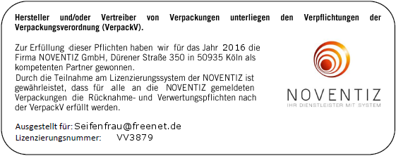 Wiederverkäufer/ Firmengeschenke/ Give-aways: Gerne produziere ich auch für Wiederverkäufer. Bitte senden Sie mir Ihren Gewerbeschein per mail zu. Möglicherweise habe ich nicht alle Artikel (sofort) in ausreichender Stückzahl für Wiederverkäufer vorrätig. Hier kann (eventuell) mit längerer Lieferzeit gerechnet werden. Kontaktieren Sie mich einfach, um die Konditionen zu erfahren. Seifenfrau@freenet.de